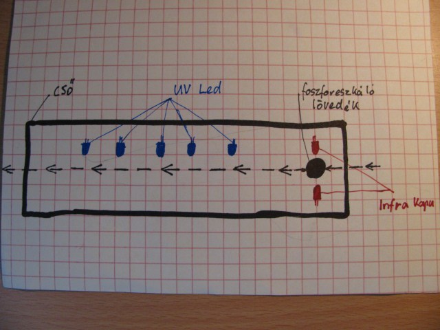 Segítséget kérnék tőletek a következőben: Szeretnék készíteni, egy az airsoftban használatos foszforeszkáló lövedék megvilágításához használatos eszközt. Az elektronikai részéhez annyira nem értek, de ha van egy kapcsolási rajz azzal már elboldogulok. Én úgy gondoltam, persze javítsatok ki ha nem jó, hogy egy infra kapu kapcsolna (minél rövidebb idő alatt) 5db uv ledet, amikor a lövedék elhalad közötte és utána kb.1 másodpercig világítana. Az áramforrás 4db AAA elem lenne. A led adatai: - Fény hullámhossza: 390...397nm - Max. áram: 20mA - Nyitó feszültség: 3,3...3,5V Lehetőleg minél kisebb elektronika kellene a hely szűke miatt.(smd?) Töltöttem fel egy rajzot az elméleti megvalósítási elképzelésemről. Kérlek segítsetek. Előre is köszönöm: Krisztián