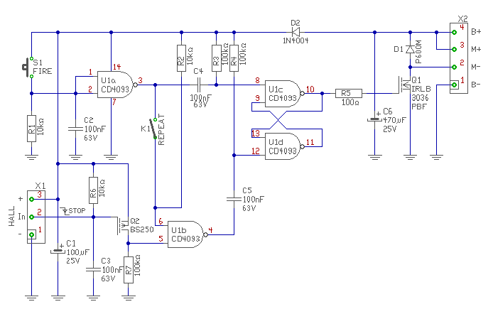 Egy olyan aramkort szeretnek epiteni, ami nagyjabol a kovetkezoket tudja: - nyomogomb, ami egy motort forgat MOSFETen keresztul - kapcsolo, ami egyik allasban engedi folyamatosan forgatni a motort - kapcsolo masik allasaban egy HALL jeladora tamaszkodva egy fordulat utan megallitja a motor, amig a nyomogombot el nem engedem es ujra zarom az aramkort (Felhasznalas: airsoft automatic electric gun automata es egyes loves vezerlese. a nyomogomb az elsutobillentyu, a kapcsolo a tuzvalto, a motor a motor, a jelado pedig a dugattyu felhuzott allapotaban jelezne. Esetleg a szerkezetben talalhato egyik fogaskerekrol, ami lovesenkent pontosan egyet fordul, lehet jelet fogni) A folyamatos forgatashoz megvan a kapcsolas, csak masik FETet hasznalnek. (IRLB3036PBF) Alap kapcsolas Koszonom a segitseget!