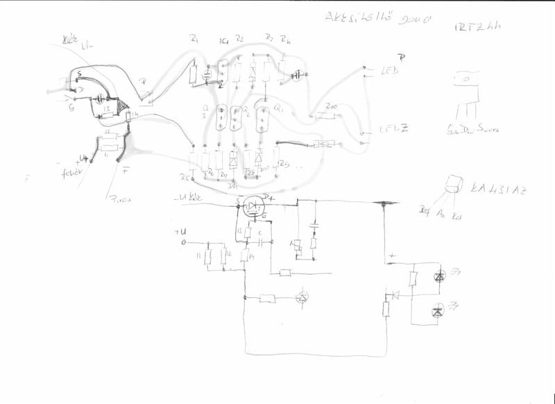 De neki nincs! TL-nél a poti csúszkát maxra, hogy lezárjon Q3, Q2, később majd beállítjuk a jó értéket. HA! jó az IRF. Azt meg kb. 10W-os izzóval D,S átmeneten nézném meg.Ha világít az izzó, az IRF az előfeszítés ellenére sem vezet, tehát szakadt. Ha nem világít, amit nem tartok valószínűnek, mert R5 kiforrasztva sem vitte zárásba, akkor a G,D átmenet összehiccent. De, hogy miért??? Akksival!
