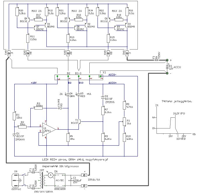 De mindenekelőtt köszi szépen a részletes számításokkal is alátámasztott elemzést. Biztosan mások is tanulhattak belőle. Sajna már rég volt, amikor ilyen számításokat csináltam és azóta egy percet sem dolgoztam a tanult szakmámba. Ezért a valamikori tudás hobbi szintren sűllyedt, messze lemaradva már, főleg napjaink technikai szinvonalától. Végül is ez segített a megoldáshoz. Számításaidnak az a része, amely az R6 ellenállásra csak 10K értéket hozott ki, kicsit elgondolkodtatott. Mia fenének van ott 220K (RTÉ adat). AZ R4 értéke az A-B szakasz biztosításához kb 87K. Ezzel párhuzamosan kötődik az R6, tehát annak a maximális értékének is jóval kisebbnek kell lennie. Betettem helyette egy 25K-s trimmert max értékre állítva. Próba. És láss csodát. Csípőből 5A-el tőlt a C-D szakaszban. Csekély szabályozással elérhető a karakterisztika szerinti 6A. És ezt produkálja úgy, hogy az IC kimenete továbbra is messze van a 0-tól. A legkisebb értéke sem ment soha 2,5V alá a kisérletezés közben. Nincs is rá szükség és valószínű, hogy ebben a kapcsolásban nem is tud lemenni. Még annyi hozzá tartozik a történethez, hogy azt a 220K-s trimmert eldobtam jó messzire. Abban a végkitérésében (már eléggé közel a vége pozicióhoz) , ahol ezt a kb 20-25K értéket kellett volna adnia valószínű, hogy kontakthibás is lehetett. Bár soha nem mertem csontra kitekerni, mivel nincs vele sorban fix értékű, az áram maximumot korlátozó ellenállás. Szóval tiéd a max. pont, dem nem tudom, hogy kell ezt a nevedre írni. Ha valamelyik moderátor olvassa, kérem tegye meg helyettem. Köszönöm