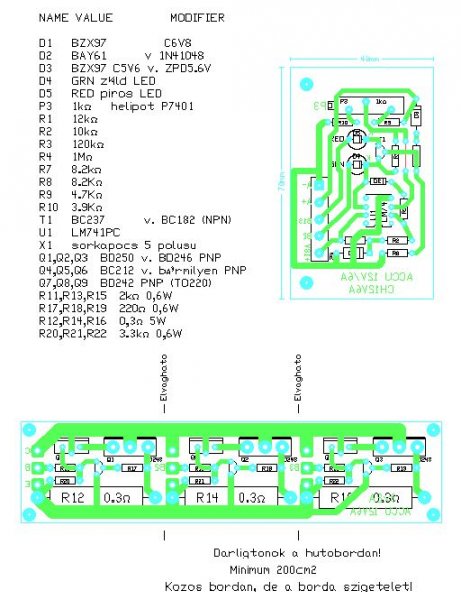 A javasolt dolgokat lényegében már végig játszottam, ha nem is pot az általad írtak szerint. Én megkisértettem az ördögöt és a T1 kollektorát direktbe földeltem, majd kiduvadt szemmel ellenörizve a kimenő áramot ovatosan szabályoztam a T2 bázis áramát a trimmerrel. Mintha semmit sem csináltam volna. Szóval addig eljutottam, hogy függetlenül a IC kimenet és a T1 bázisának egymáshoz való viszonyától, ami továbbra sem úgy vezérlődik, ahogy szerintem kellene, magában a teljesítmény körben is van valami hiba. Most már csak arra tudok gondolni, hogy a BD250 tranyónak az erősítése jóval kisebb lehet mint a TIP 2955-nek. Hűtóborda méret miatt lett a BD250 betéve, de most már beteszem próbára az RTÉ-ben írt eredeti tranyót.
