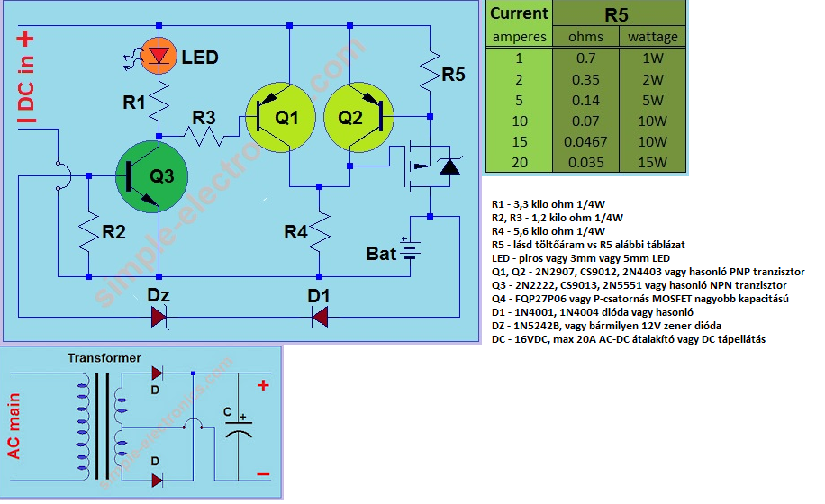 MBR745 - Egyenirányító dióda; 45V; 7,5A; TO220AC A trafó és az egyenirányítása majd később. Köszi. Idézet: „a D3 és D4 milyen legyen” Én ezekre gondoltam shottky-t (D3 nem annyira fontos). Viszont mindkettőnek nagy áramúnak kell lennie, a D4-en üzem közben, a D3-on az akku fordított polaritású összekapcsolása esetén, a biztosíték kiégéséig fog nagy áram folyni. Az ellenállások közül csak az Rx-en fog jelentős áram folyni, és fog 3W körül disszipálni. Üdv Inhouse