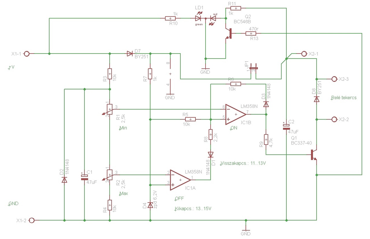 Szeretnék egy kis segítséget kérni! Megépítettem az ebbe a topicban talált CHG-CMP2-sch.png kapcsolási rajzot annyi változtatással, hogy tettem rá egy DUOLED-es kijelzőt és annyiban alakítottam át, hogy a relé táplálása a töltőtől menjen ha meghúz, de egy jumperrel vissza alakíthatóra csináltam. A relé egy 12V-os autó relé Le akartam tesztelni egy kis akkuval, de nem azt csinálja szerintem amit kéne. A következőt csinálja a kapcsolás. Ha az akkut a bemenetekre kötöm a töltő helyére (mintha a töltő lenne ott, mint fesz. forrás) a relé magas hangon zúg. Ha az akku helyére kötöm akkor mélyebben zúg mint egy rossz csengő. Érdekes volt, hogy rámértem az LM358 bemeneteire és kimeneteire. A potmétereket csavargatva változik a feszültség a 2-es és 6-os bemeneten, a 3-as és 5-ös bemeneten kb. ugyanakkora feszültség van (6,3V), a kimeneteken viszont nem változik a feszültség a potméterek állítására. Egyiken sem. Ma a relé jól működik azt kipróbáltam külön. Az akku bemenetre (a kétpólusú sorkapocs) egy kis kapcsolóval megy a fesz. az akku kapcsolódásról. Ha ezzel kikapcsolom az idfe érkező feszt, akkor a LED piros, ha bekapcsolom, akkor sárga színű. Lehet rossz az LM358 esetleg? Ha kell megmérem amit javasoltok és leírom. Köszönöm a segítséget előre is! |