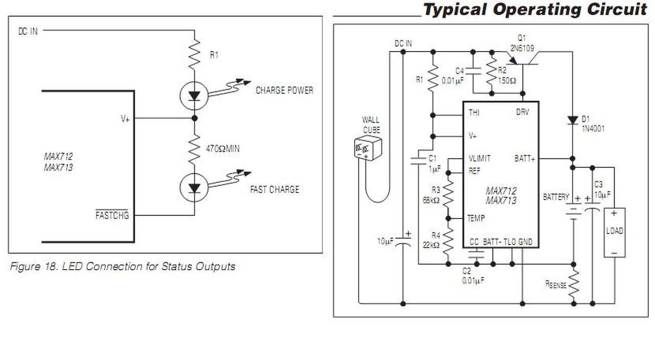 MAX713-al építek töltőt egy 18V-os csavrozóhoz. Az adatlap 18. ábráján két LED bekötése szerepel. A kérdés az, hogy miért eröltetik a V+ on való átvívést, amikor ki van kötve, hogy a belső regulátornak az R1-el be kell állítani 5mA-20mA áramot. Arrol semmit sem ír, hogy a LED áramát bele kellene ebbe számolni. (FASTCHG) A FASTCHG lábat a tokon belül a BATT- ra húzza, nem a testre. Kérdés, hogy lehet-e a LED-et a DC IN re kötni V+ helyett? (Úgyszint a power ledet is direkt tápra. A plusz egy ellenállás nem számít)