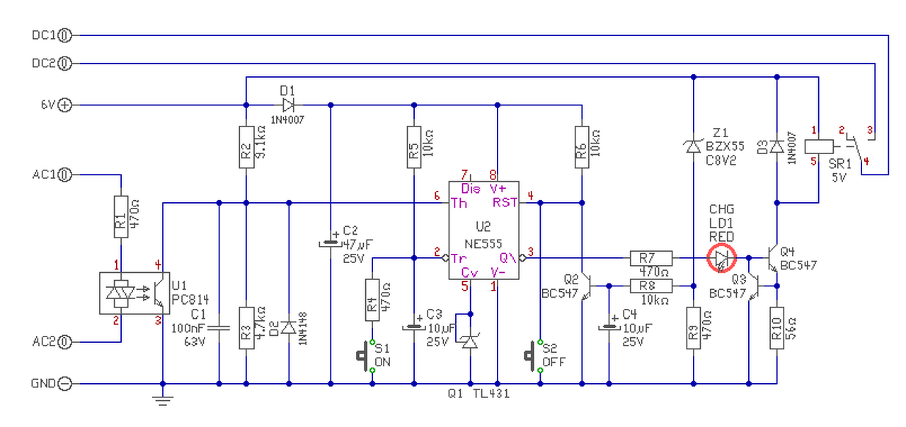 Mert nem írtam le a működését az áramkörnek. De az opto csak a nullponton van kikapcsolva. Vagy is akkor, mikor a töltő és az aksi között nem folyik áram. Mintegy kapuzza a feszültség figyelést. Ennek célszerű oka az, hogy így a kapcsolás figyelmen kívül hagyja a töltőáram hatására létrejövő feszültség emelkedést, de főképpen a vezetékek átmeneti ellenállásával okozott hibát. Vagy is még akkor is jól méri vissza a 555 komparátor a feszültséget, mikor a töltő és az aksi közé egy izzót tesznek. Kapuzás nélkül ez nem lenne lehetséges. De megoldható úgy is ahogy az eredeti áramkör első példányában volt, hogy két segéd diódával egyenirányítjuk a töltő váltófeszültségét, és egy mezei tranyóval kapuzzuk a komparátor feszültségét. Ekkor nem kell opto. De előfeltétele a dolognak, hogy a töltőben egy egyenirányító híd legyen, az aksi és a híd negatív pontja közös legyen, a relé a híd pozitív ágát kapcsolja. Mert a két segéd dióda és a főegyenirányító híd alsó ága alkotja így a teljes hídkapcsolást. De ennek akár hozadéka is lehet, ha a relét is erről a segéddiódákról tápláljuk. Mert töltés közbeni hálózat kimaradás esetén nem terheli az aksit a relé..