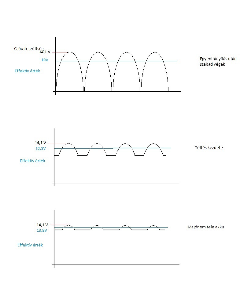 Szemléltető ábra a töltés közben mérhető feszültségekről. DC-nél is van effektív érték.