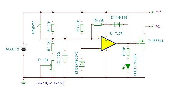 Hogy tudd kivel beszélsz, elárulom, hogy nem tudtam, hogy ez egy emitterkövető kapcsolás... A hiszterézis kifejezést nem kellett volna használnom, csak azt akartam érzékeltetni, hogy tápegységről kipróbálva 12V-ról indulva kb 9V-nál aludt el az égő. Légyszíves áruld el hogyan tudsz ilyen szép rajzot csinálni? Én papíron, ceruzával megrajzolom, beszkennelem BMP formátumban, átkonvertálom JPG-be és már tehetem is fel! A küldött kapcsolásodban lehet-e egyszerűsíteni? A LED-et az előtét ellenállással kihagyhatom-e, BE gomb kell feltétlenül? A FET és D1 tipusa mennyire kényes?(kicsi a választék a fiókomban) erősáramú