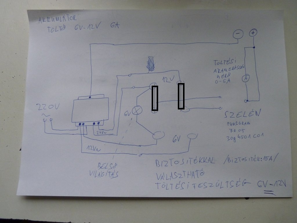 Ebben a töltőben nem graetz kapcsolású szelén volt hanem két dióda.Az ampermérő itt is sorba van kötve,csak van neki egy párhuzamos söntje,mert enélkül a műszer max miliampermérő lenne.
