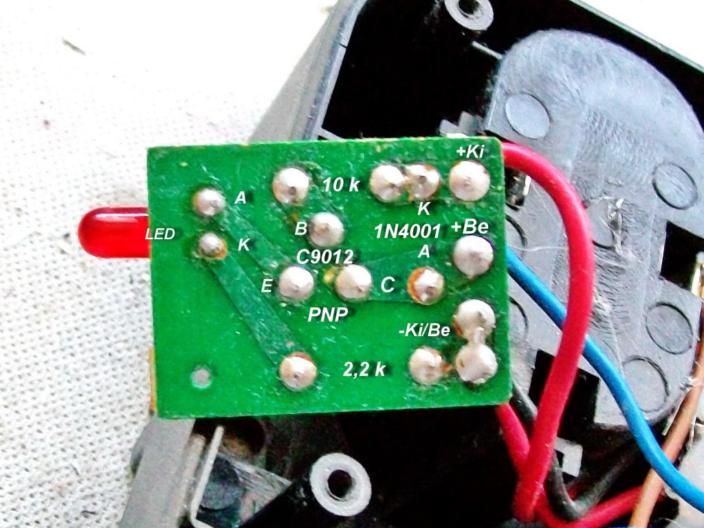 Az ellenállások 0,25-0,6 W-osak. A töltő árama a diódán folyik át, az azon eső feszültség nyitja a tranzisztort. A bázis körében lévő 10 kohm a bázisáramot korlátozza. A LED áramát a 2,2 kohm állítja be. Üdv.: Feri