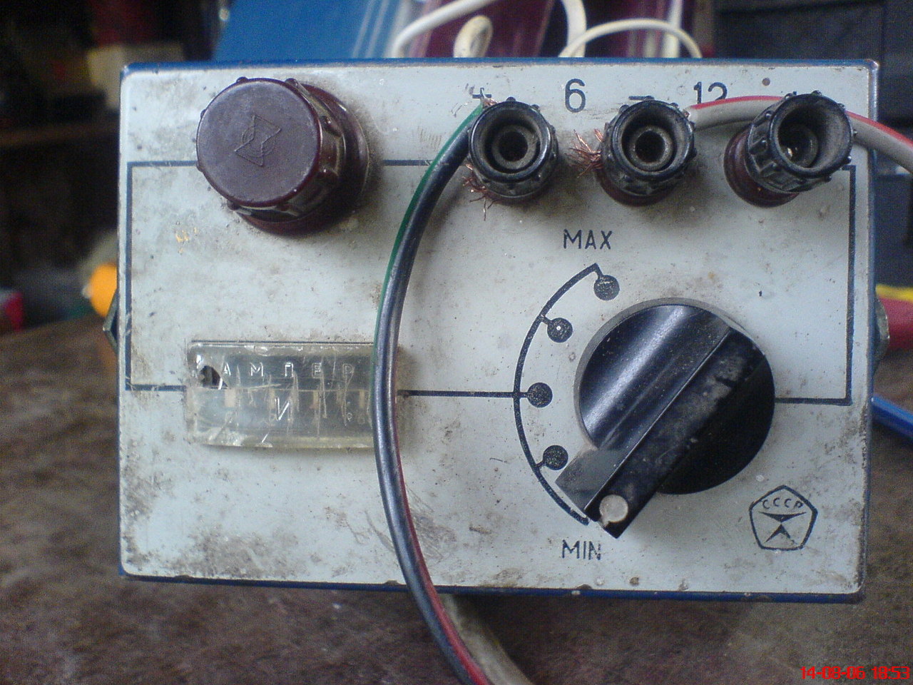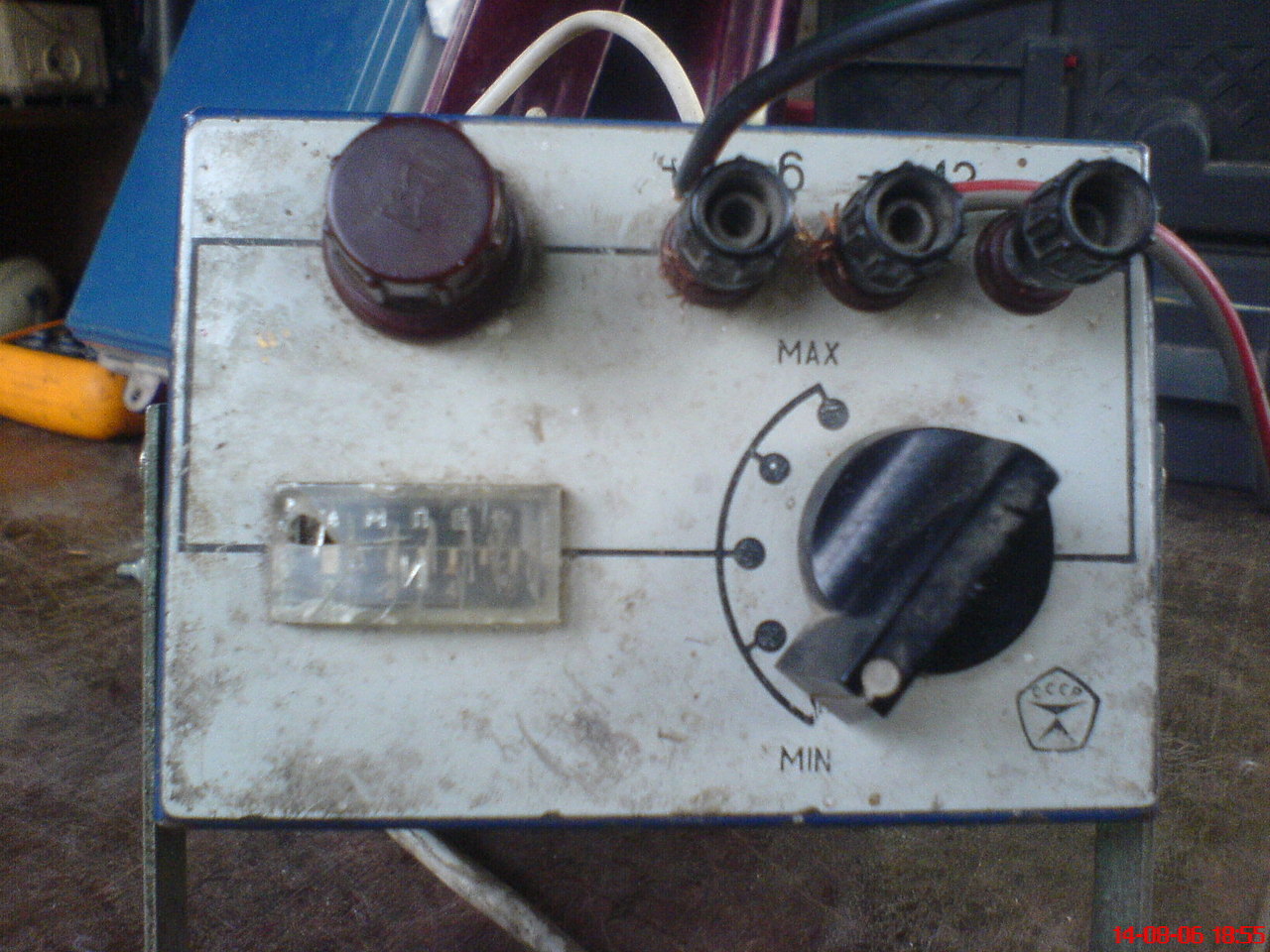 Ez egy annyira régi orosz töltő ami úgy néz ki,hogy van benne egy tekercs amibe be megy a 230V majd a másik oldalon kijön öt vezeték egy forgó kapcsolóra ami fokozatosan kapcsolja az ampereket.Van rajta két kimenet a főoldalon egy 6v és egy 12v, közöttük meg a negativcsatlakozás. Van még rajta egy átlátszó fehéres színű műanyag félkörives ablak ami mögött van az amper mutató. A bal felső sarokban pedig a betáp biztosíték.