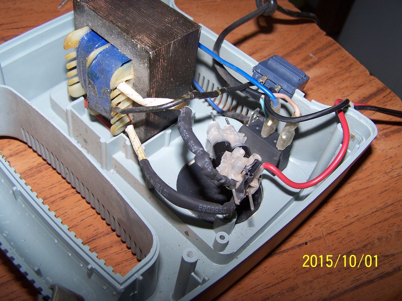 De ez a "kis trafó", látszólag erősen megsült képet mutat. De célja sem ismert még. Vagy valami fojtótekercs, vagy ezzel van szabályozva a nagy trafó szekunder feszültsége (összegként). Egy kapcsolási rajz, nagyon nem ártana.. De a 40A? Maximum a kimenti vezeték viselné el, a többi vezetékből nem nézek ki sokat..