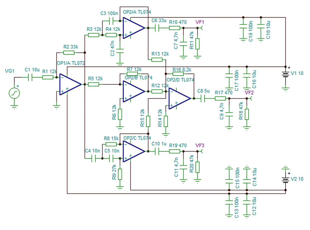 A NYÁK megtervezése komoly kihívás. Sokat segítesz magadon, ha szimmetrikus tápra térsz át. Ne feledkezz meg az IC-k helyi tápszűréséről, hogy össze ne gerjedjenek. A két bemeneti fokozatot egy TL072-be vonnám össze és azok alacsony kimeneti impedanciáján küldeném a szűrőkre ami praktikusan TL074-ből építhető.