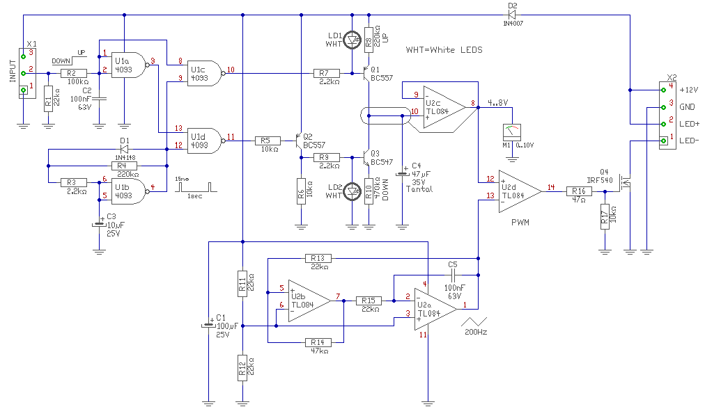 Pont ilyet készítettem egy ismerősömnek akvárium világításhoz. Egy külső időkapcsoló adja a start és stop jelet. A start csak egy segédtápból áll, ami meghúzza a fő táp reléjét és innentől indul a fényerő növelés. Ha a segédtáp megszűnik akkor elkezd csökkenni a fényerő, majd ha elérte a nullát akkor a relé is elenged és teljesen áramtalanít. Csak a segédtáppal tud újra elindulni.