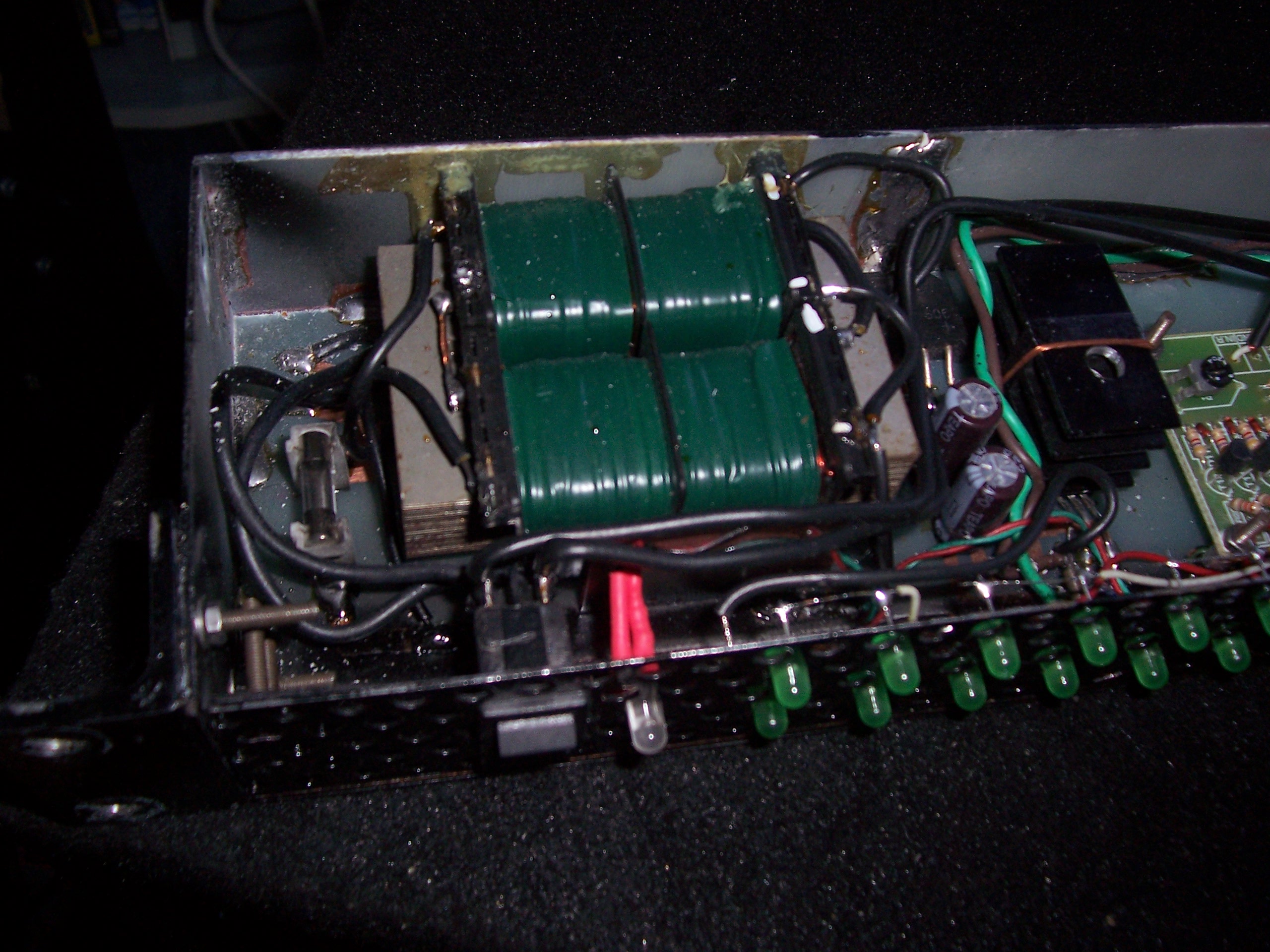 A tetején vannak a foglalatok, ennek a ásik oldalán pedig normális vezetőmintázat, és erre vannak forrasztva az oldallapok, Az szembenlévő oldallapokra M3-mas csavaranyák vannak forrasztva, és még a maradék két oldalra meg valamilyen pöcök ami tartja az alját (Küldök belsőnézeti képet) A rádió lelke a TDA7000-es mono vevő IC, (ennek a sztereó párja a TDA7021+TDA4040-es sztereó dekódoló iC). Az elején kék led van , 1 fülhallgató csatlakozó. A rácsokhoz meg nem kaptam krómozott M4-es csavarokat. KeserűCukornak üzenem: létezik 1 gombos hangolásosos IC : TDA7088 Aki rádiót akar építeni ajánlom az alábbi oldalt (nemrég találtam) [link=http://www.mikroelektronika.co.yu/english/product/books/rrbook/chapter4/chapter4c.htm]http://www.mikroelektronika.co.yu/english/product/books/rrbook/chap...4c.htm[/link]