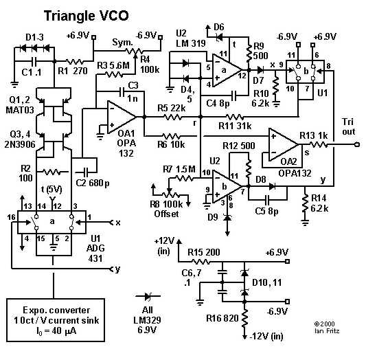 Hangszer céljára a mellékelt VCO-t javaslom, többször megépítettem, nagyon megbízható, alapból egyszerüen beállítható a lineáris feszültség frekvencia görbéje. Vezérléséhez lineáris billentyűzet szükséges, azaz ahány záró érintkező, annyiszor 100 Ohm sorba kötve. Ha elhagyod az áramkör exp részét,akkor exp billentyüzet kell, ami záróérintkezőnként 2 db ellenállás hálózat 1:150-hez, vagy 1:300 hoz. A VCO ból 1 fettel fűrészjel is kivehető. HANGSZERHEZ 2 VCO-t szoktak építeni.