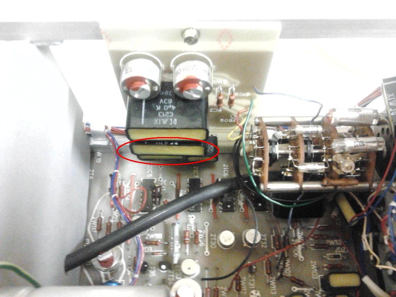 Nem régen kaptam egy Orosz C1-65 szókopót. Első bekapcsoláskor elég sokára, de lett kép. Pár héttel később bekapcsolva nem volt fényerő. A potit tekergetve fel-fel villant a vízszintes csík. Potit kicseréltem és jó lett, lehetett fényerőt szabályozni . Ez után fényerőt feltekertem maximumra és úgy maradt a képernyő teljes fényerővel, hiába tekertem le. A mellékelt képen bejelöltem egy ellenállást ami elégett. Csere után megint nincs fényerő. A csere poti is 10k-ohmos volt. Az eredeti és a csere poti is műszerrel jónak tűnik.