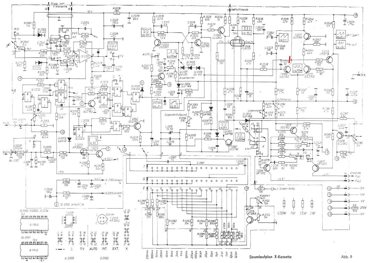 Nanok: Oszcilloszkóp csak az eltérítő generátor, és a szinkronizálás ellenőrzéséhez kellhet. A többihez elég egy multi. A +1620 V ha nincs meg, attól még világítania kellene, ha halványan is. A tanszverter kimenetén, és a ks csövön is ellenőrizd a feszültségeket, lehet, hogy a kivilágosító áramkör lezárja a csövet, ezt a "Helltastimpuls" környékénkeresd.