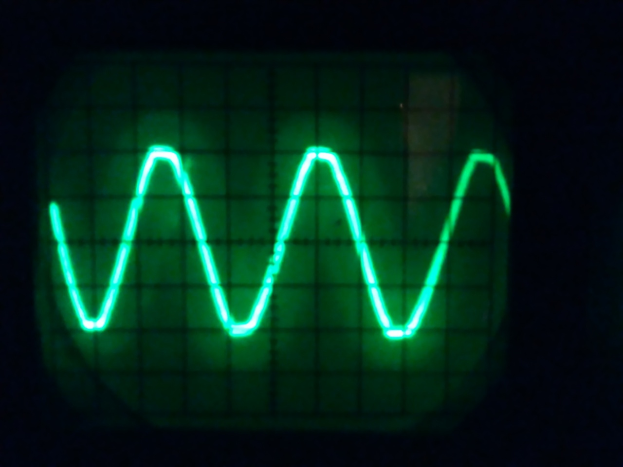 A periodusa a képen mintegy 34 osztás, nem tudjuk milyen az X felbontás,de ezek szerint ez a 3,4 osztás felel meg 20 ms-nak. Azaz vizszintesen kb 0,59 ms egy osztás
