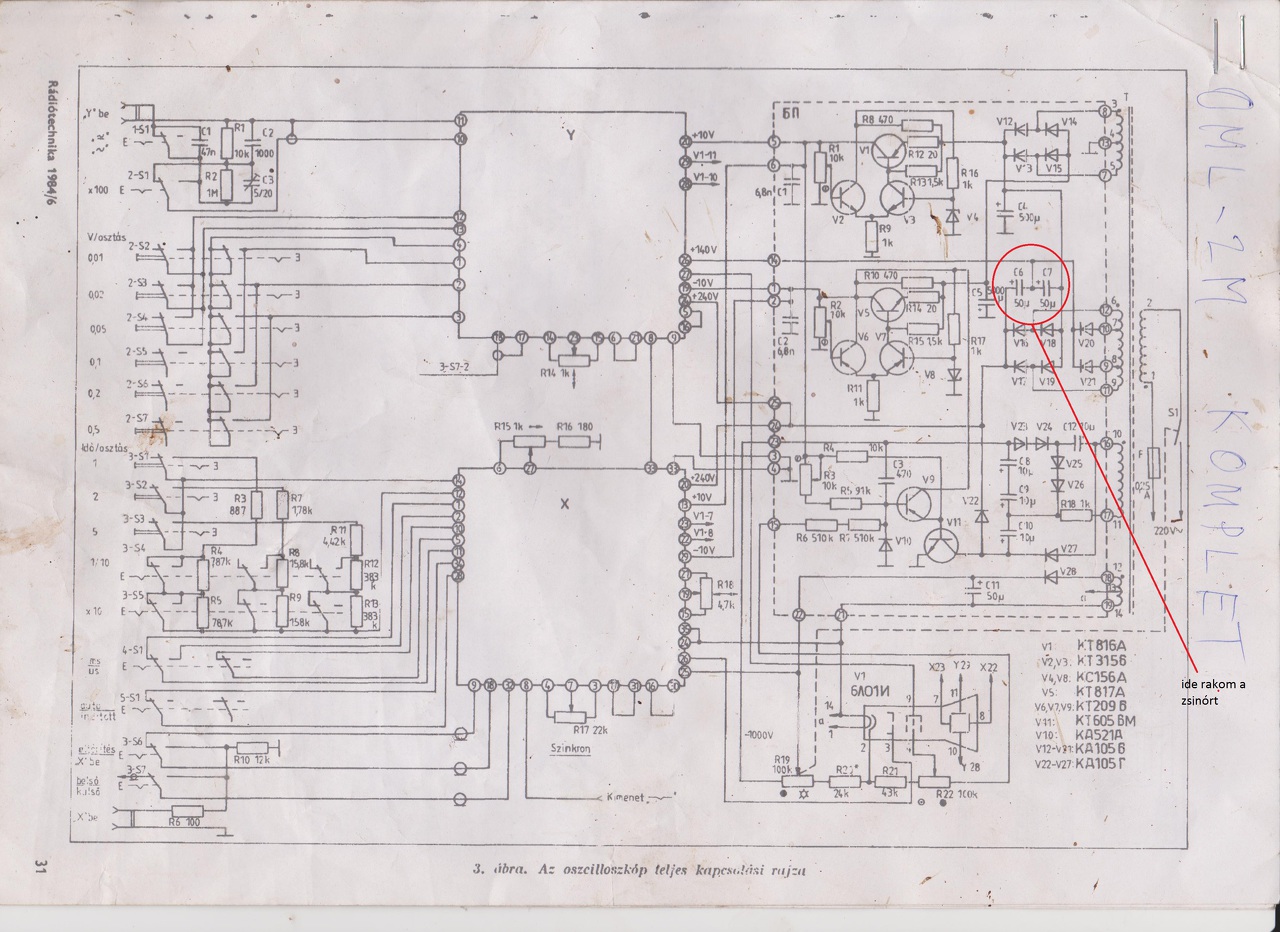 Van nekem egy OML-2M szovjet gyártmányú oszcilloszkópom,sajna rossz! Az egyik hiba az amikor levettem a függőleges és a vízszintes eltérítést akkor a sugárnak gondolom középen kéne hogy legyen,de nincs ott,csak akkor ha a C7 vagy a C6 kondi egyik lábához hozzárakom a multiméter egyik zsinórját 1-2 másodpercre ( a képen bejelöltem). A másik hiba meg 140V helyett 160V-ot mérek rajta. Hol bírnám lecsökkenteni a feszültséget. Segítségeteket előre is köszönöm! A hozzászólás módosítva: Okt 15, 2018
