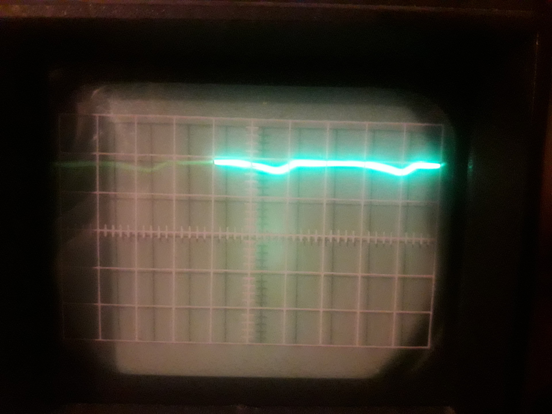 Csináltam képet róla, de csak telefonnal tudok. Remélem látszik. A sugár a közép vonalnál egyenes. Az X kapcsoló 30 ms/T állásban van. Ha a poziciónáló pométerrel a függőlegesen eltolom a vonalat, akkor látszának a kis jelalakok. 3 ms/T felett már csak több sugárnyalább látszik, gondolom a brumm szinuszjele.