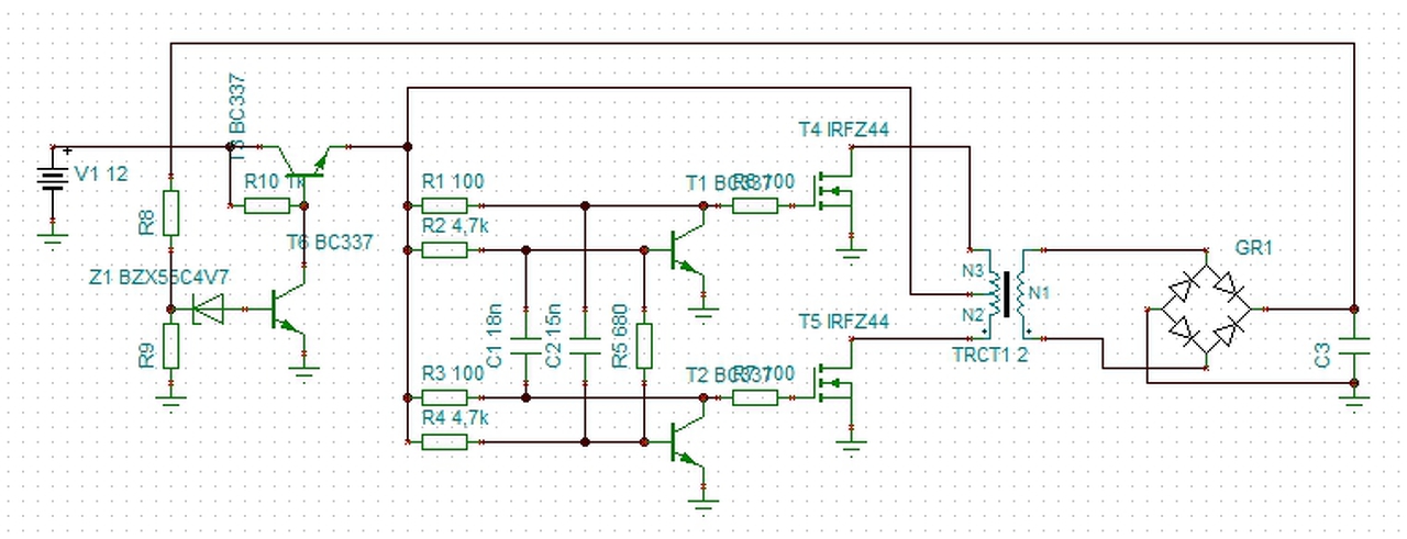 Csináltam egy skiccet róla hogy hogyan nézett ki a konverter. A 12V DC-ből egy multivibrátor 2 fettel és egy trafóval nagyfrekin csinált néhány 100V DC-t, ez a nagyfesz egy osztóval vissza volt csatolva az áteresztőtranyós fokozatra, tehát az áteresztőtranyó a szekunder DC függvényében szabályozta a primer oldal tápfeszét, így az adott terhelésértékeken belül viszonylag stabil maradt a szekunder fesz. Nyilván nálad az AC-t kellene adott amplitúdón tartani, de annak a csúcsát (vagy egy leágazásának a feszültségét) is el lehetne tárolni egy kondiba, amit aztán vissza lehetne csatolni a primer szabályozáshoz. Biztos nem lenne olyan stabil, meg gyors sem, de ez talán nem is baj, mert nem termelne egyéb zavarokat a gyors szabályozás.
