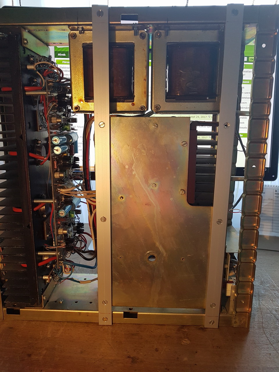 Most már csak el kellene indítani az erősítőt, hogy megnézhessem mit csinál, hogyan működik. Azt tudom, hogy ez egy hidalt erősítő, de a kis panelnek az előlap mögött mi lehet a szerepe?