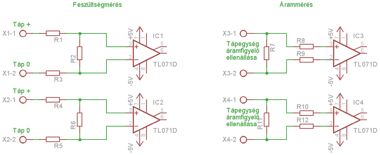 Kicsit kihaltnak tűnik a téma, de hátha valaki erre jár. A kérdésem az lenne, hogy ha van egy kettős tápegységem, amiknek nincs közös pontja, tehát két külön szekunderről vannak táplálva és nincs összekötve egyik kivezetés se a trafónál, akkor hogyan tudom egyszerre mérni a két tápegység áramát és feszültségét egyetlen PIC-el? Ugye a probléma az, hogy a nullákat nem köthetem össze, mert akkor a tápegységek nullája is össze lenne kötve. Azt láttam itt, hogy az árammérést hogyan lehet megcsinálni föld független módon, de nem tudom ez így működne-e, ha fezsültséget szeretnék mérni. A tápegység 0-30V, 0-3A, ebben a tartományban szeretnék mérni. Van egy elképzelésem, amit csatoltam, de nem tudom, hogy ez így jó lenne-e. Amit itt láttam volt egy tranzisztor az erősítő kimenetén, de szerintem meg tudja hajtani az erősítő a PIC bemenetét. Egy diódával esetleg megvédem még, hogy negatív feszültséget ne tudjon kapni a PIC. Meg az ellenállásokat ki kell számolni, hogy jók legyenek az osztások, csak az érdekel, hogy az elv működik-e. Ha valaki tudna segíteni, azt megköszönném.