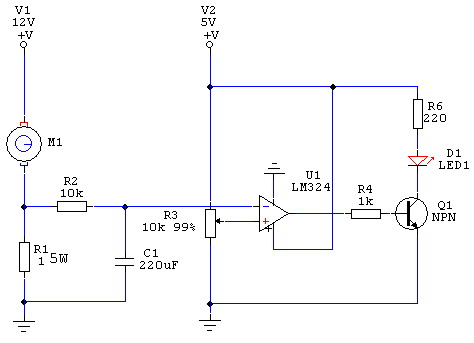 Mellékeltem egy kapcs. rajzot, mely egy motor áramát figyeli egy soros ellenálláson és billegtet egy komporátort.