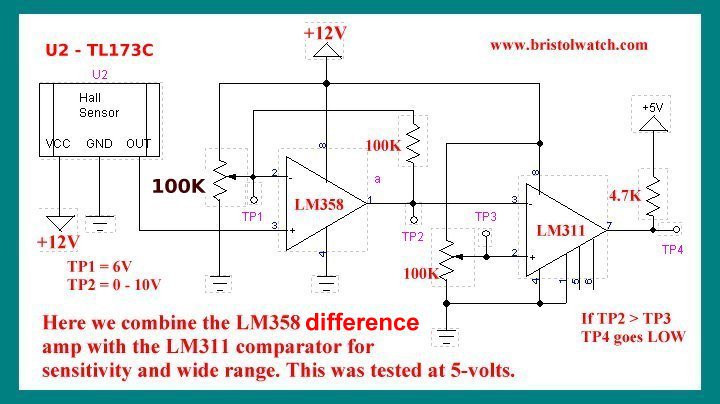 Olcsó megoldás.: Régi floppymeghajtó motorjában van 3 db mágneses érzékelő. De minden DC ventilátorban is van 1-1. Általában kapcsoló karakterisztikájúak. Azaz egy tranzisztor, esetleg darlington már elég utána, nem kell műveleti erősítő. Érzékenység növelésére.: Ferrit vagy porvas gyűrűbe rést köszörülünk, amibe bele lehet csúsztatni - ragasztani az érzékelőt. Sokkal kisebb áramra reagálni fog.