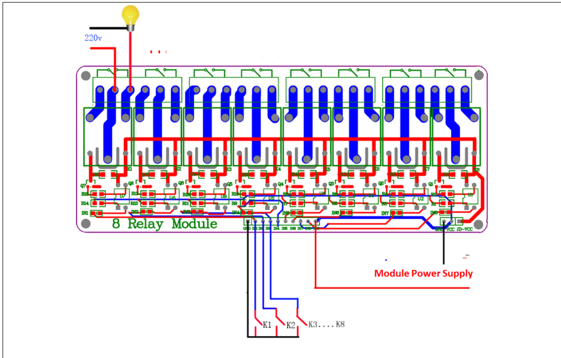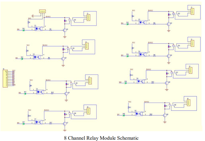 Semmi különöset nem csináltam, egyszerűen direktben rákötöttem a RPi I/O portokat a relék IN1 ... IN8 portokra.