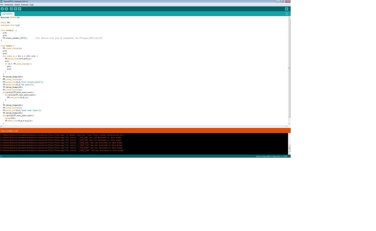 Idézet: „C:\Users\Dominik\Documents\Arduino\libraries\TVout\TVout.cpp: In member function 'void TVout::render_setup(uint8_t)': C:\Users\Dominik\Documents\Arduino\libraries\TVout\TVout.cpp:730: error: '_VID_DDR' was not declared in this scope C:\Users\Dominik\Documents\Arduino\libraries\TVout\TVout.cpp:730: error: '_VID_PIN' was not declared in this scope C:\Users\Dominik\Documents\Arduino\libraries\TVout\TVout.cpp:731: error: '_SYNC_DDR' was not declared in this scope C:\Users\Dominik\Documents\Arduino\libraries\TVout\TVout.cpp:731: error: '_SYNC_PIN' was not declared in this scope C:\Users\Dominik\Documents\Arduino\libraries\TVout\TVout.cpp:732: error: '_VID_PORT' was not declared in this scope C:\Users\Dominik\Documents\Arduino\libraries\TVout\TVout.cpp:733: error: '_SYNC_PORT' was not declared in this scope” A hozzászólás módosítva: Dec 13, 2014