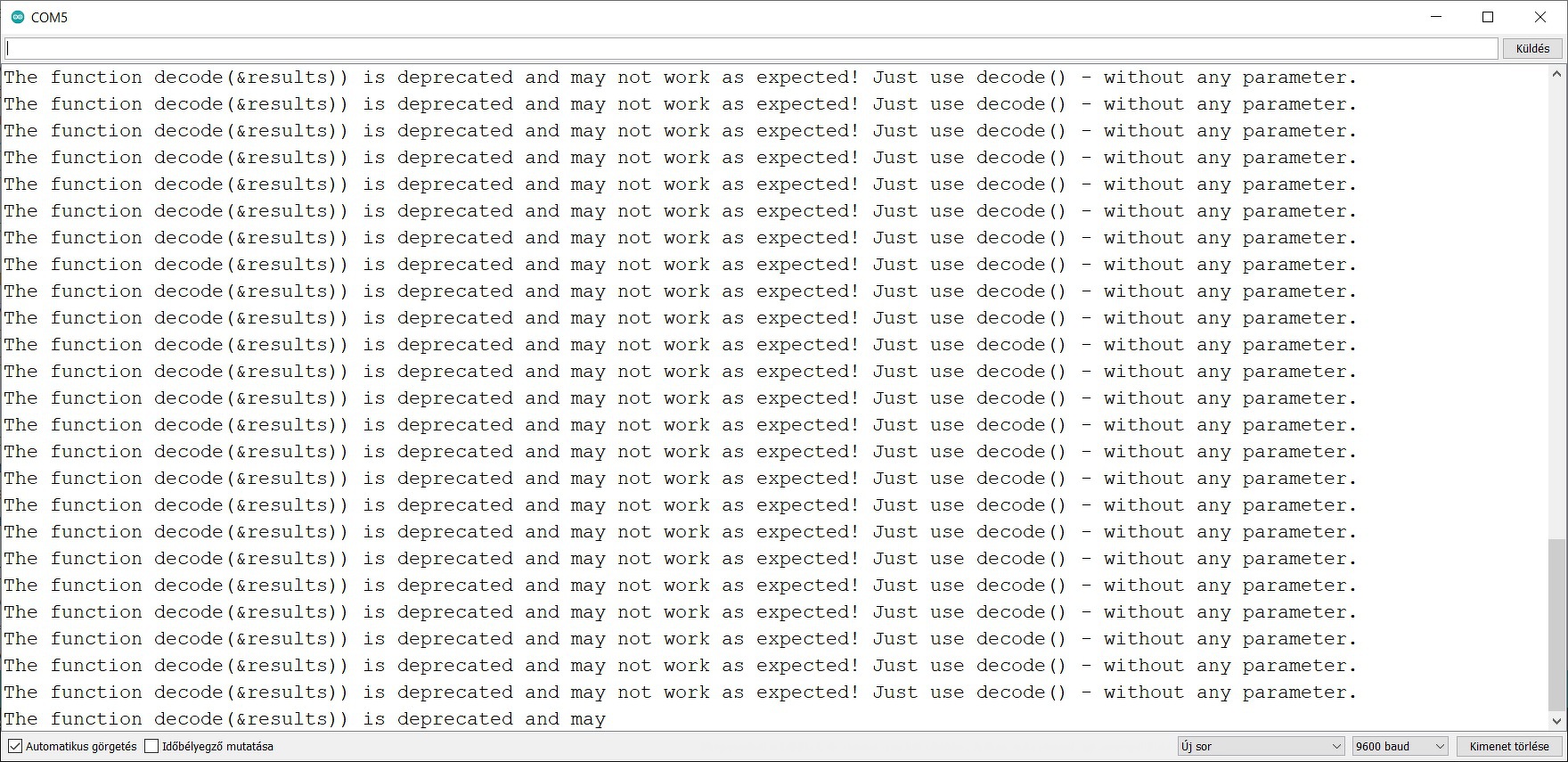 Ha kiveszem a &results paramétert, akkor normálisnak tűnik a program futása, de bármilyen távirányító bármelyik gombjára csak nullákat ad vissza. Tehát valamit vesz, működik a vevő is és jó bemenetre van kötve, de valami mégsem klappol. Az IR vevő egy TSMP58000.