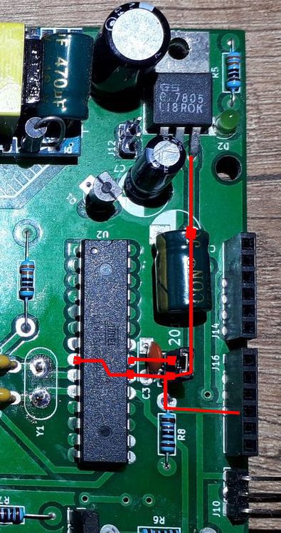 A képen a jobb felső sarokban a D2 zöld led a 7805 mellett 330Ω előtéttel.
