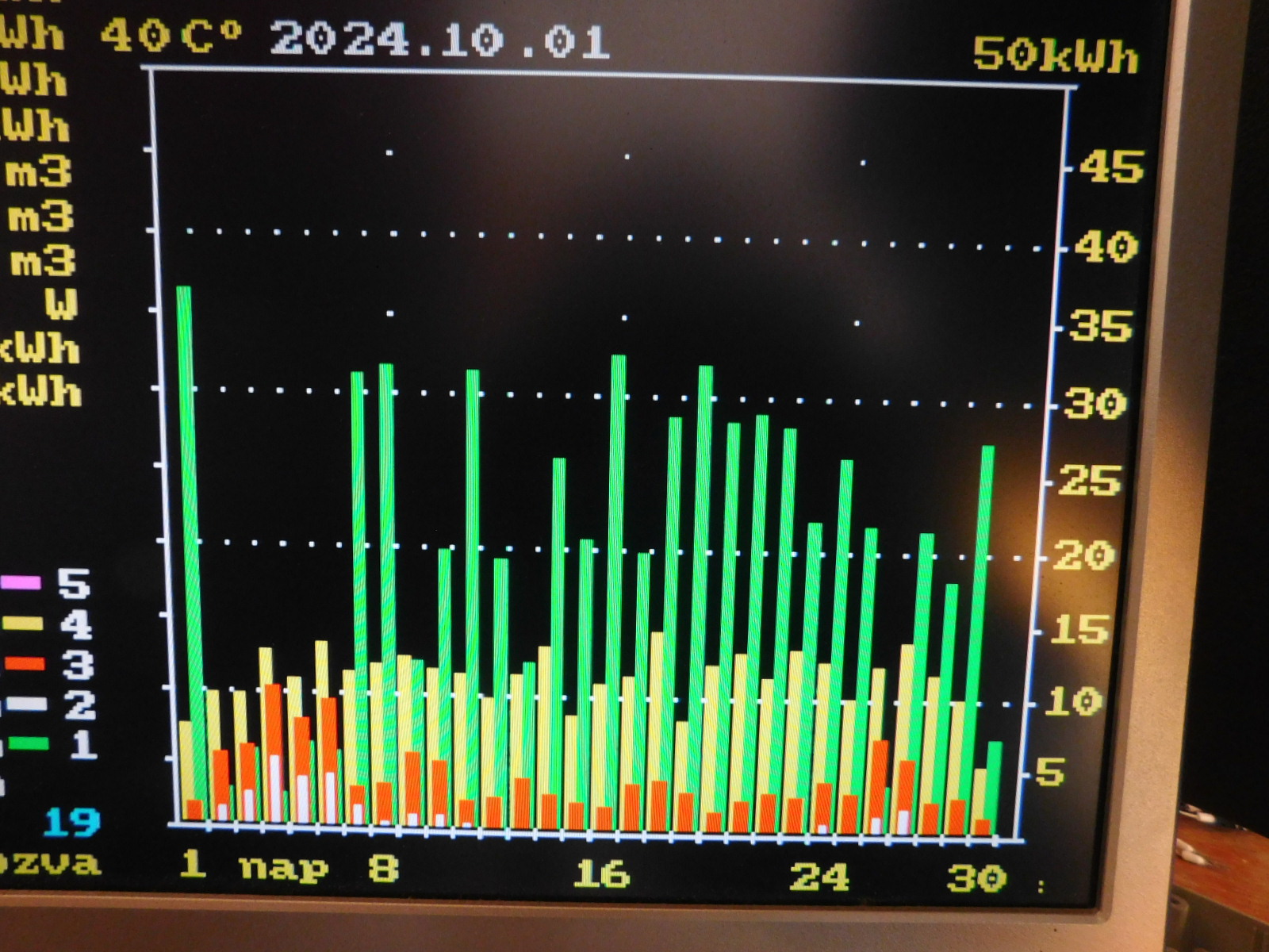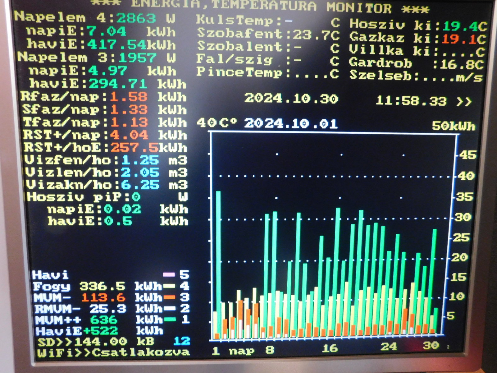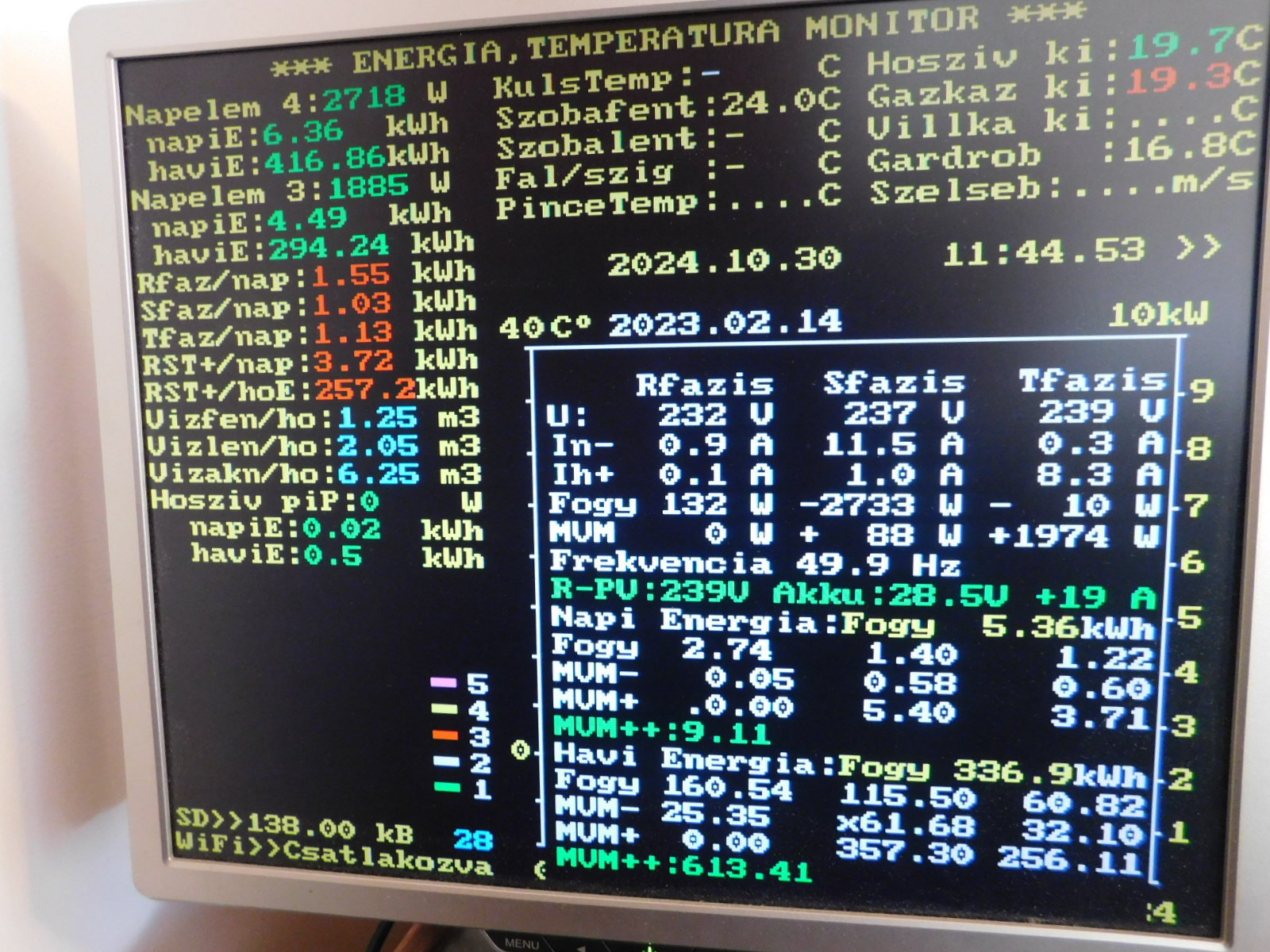 Sikerült szóra bírni az SML II invertert,megvannak a napelem és az akku adatai.A hálózat adatait három JSY 194 adja,az inverter meg rs485-el.Az R fázison van a hibrid 14 kWh akkuval,az S,T fázisokon két EHE visszatáplálós inverter.A monitoron jól látható mi történik a hálózaton,a valós fogyasztás/MVM vételezés különbsége és a betáplálás.A hibrid alaposan csökkenti az MVM vételezést,de visszatáplálósoknál kis odafigyeléssel is eredményes.A szenzorok és rs485 kezelést a pincében az inverterek mellett egy Mega 2560 végzi,az adat feldolgozást három szinttel feljebb(30 m kábel után)ESP32 a monitorral.Az volt a cél,mennyi felesleges energiát lehet elvenni a napelemektől más hasznosításra,mint a visszatáplálás.A következő cél ennek megvalósítása lesz.