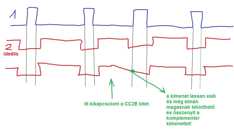 Akartam szkóp ábrát helyette rajzo inkább lerajzoltam mi a helyzet. Azt gondolná az ember hogy ha kikapcsolom a CCxE bitet bármely kapunál akkor a kimenet azonnal alacsonyba vált de ehelyett olyan mintha egy kondenzátor kisülne a kimeneten csak lineárisan. Emiatt elég nagy galibák lehetnek pl komplementer módban használom és simán összenyitnak a kimenetek. Kicsit dilemmában vagyok hogy egyáltalán szabad e CCxE biteket használnom emiatt üzem közben.