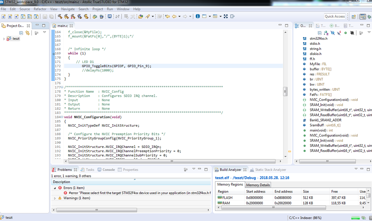 Sajnos a debug indítása 30mp, de legalább megy. Csatoltam egy képet. Ami debug módban lefordul és működik, az nem jól relase módban. Idézet: „Description Resource Path Location Type #error "Please select first the target STM32F4xx device used in your application (in stm32f4xx.h file)" stm32f4xx.h /teszt/src line 102 C/C++ Problem ” Mire kell itt gondolnom? Azt értem amit ír, csak azt nem hogyan adhatnám meg neki amit kér.