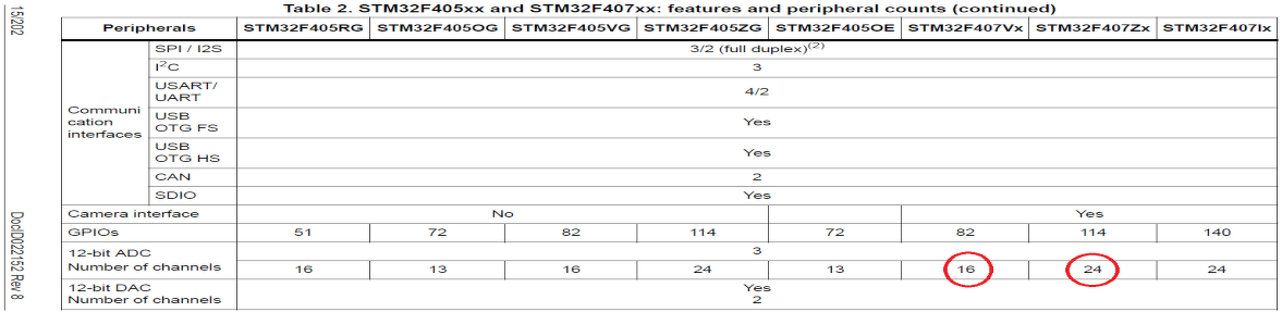 Amit találtam ezekhez specit, abban az F407Vx-hez 16 csatornát ír, az F407Zx-hez pedig 24 csatornát. Tudnál linkelni egy olyan specit, amiben 25/32 pin(channel) van?