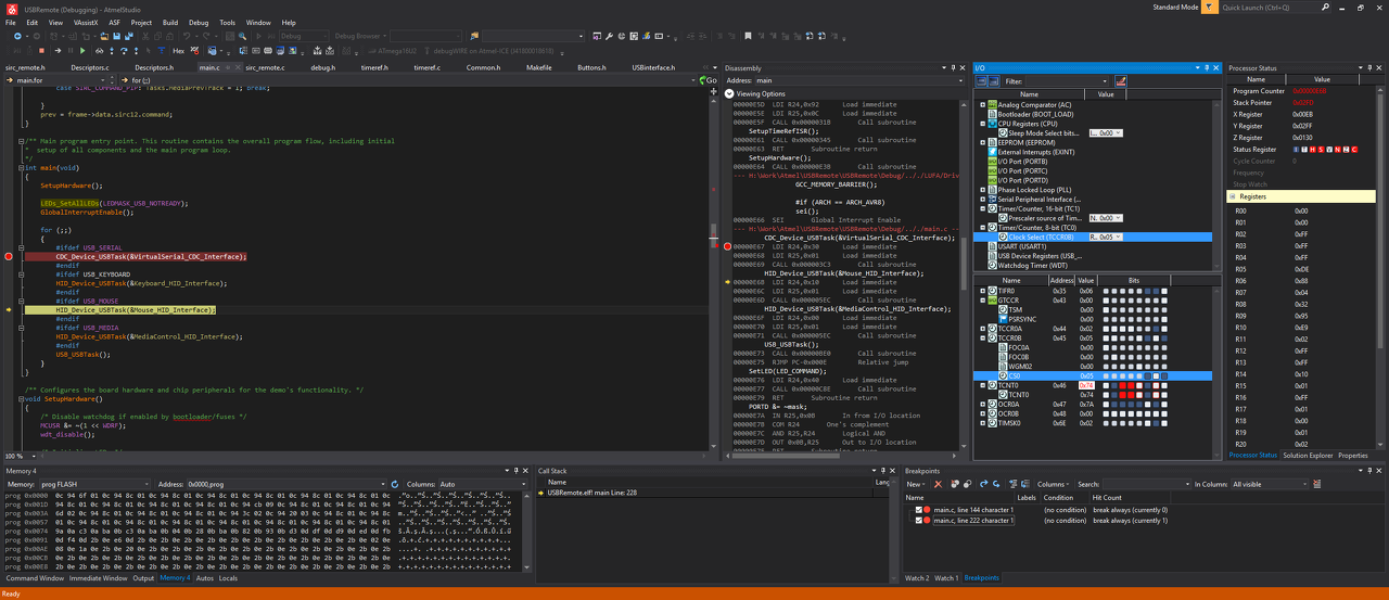 A debuggolás pont ugyanolyan jól megoldható AVR-nél is mint az ARM-oknál, csak normális programozóra van szükség, nem ilyen USBASP féle borzalmakra. Rendes programozóval látszanak a regiszter állapotok, a live értéke a változóknak stb., pont úgy mint mondjuk egy STMicro-nál, lásd képen. Annyi nehezítés valóban van, hogy nem ugyanoda tették minden chipnél a debug-ot, illetve nincs mindig debugWire (ATMega esetén, ATXmega-nál már más van, az jobb).