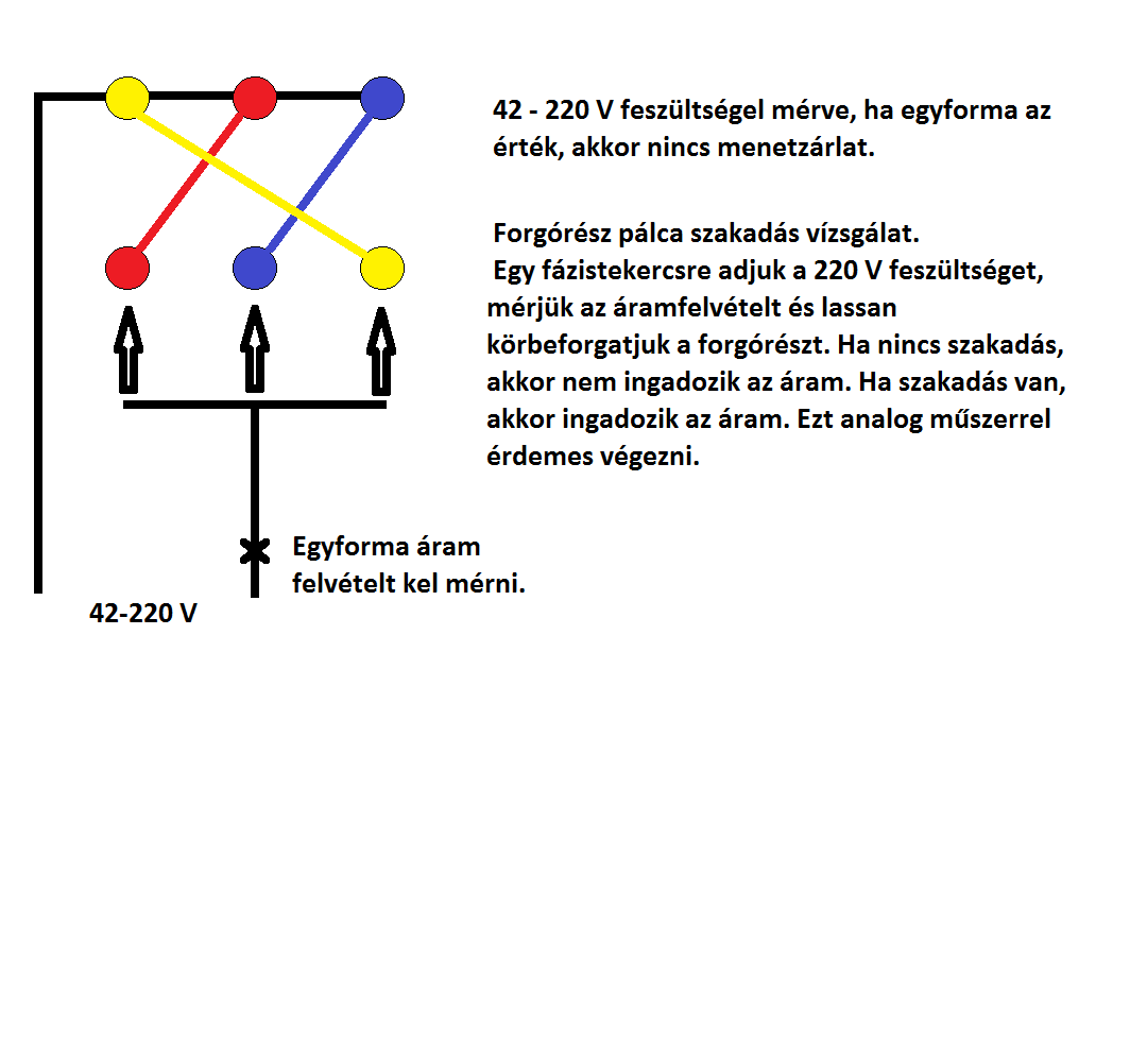 A villanymotot üzembehejezem temészetesen ampermérövel bekapcsoláskor indulo áram felvétel majd üresjarási áram fevétel. A forgorészt forgásközben folyamatosan terhelem az üresjárási áram lineálisan emelkedik ezzel szemben a fordulat csokken majd megáll a forgoresz. Ebben az esetben szakadt a kalicka A jo esetén üresjási áramfevétel emelkedik egy pontig majd a forgorész hirtelen megáll és nagyon nagy lesz áramfelvetel.En 38év alatt 3 esettel találkoztam .Röviden trafo elmelet aszinkron motorra értve nicsmegfelelö erövonal metsés nics erö sem A kalicka a tr szekunderének felel meg . János