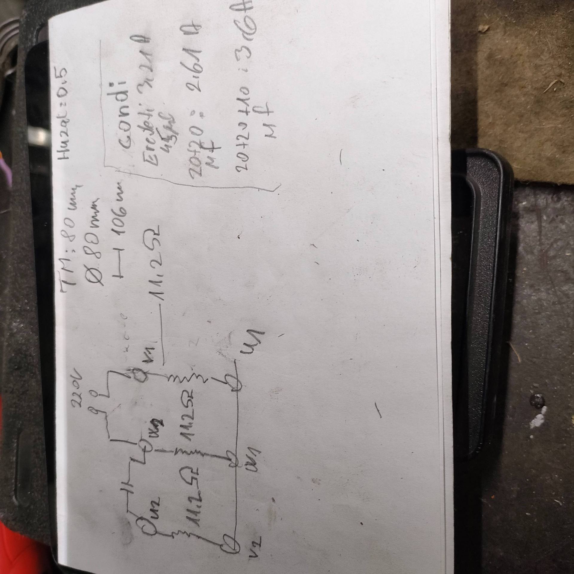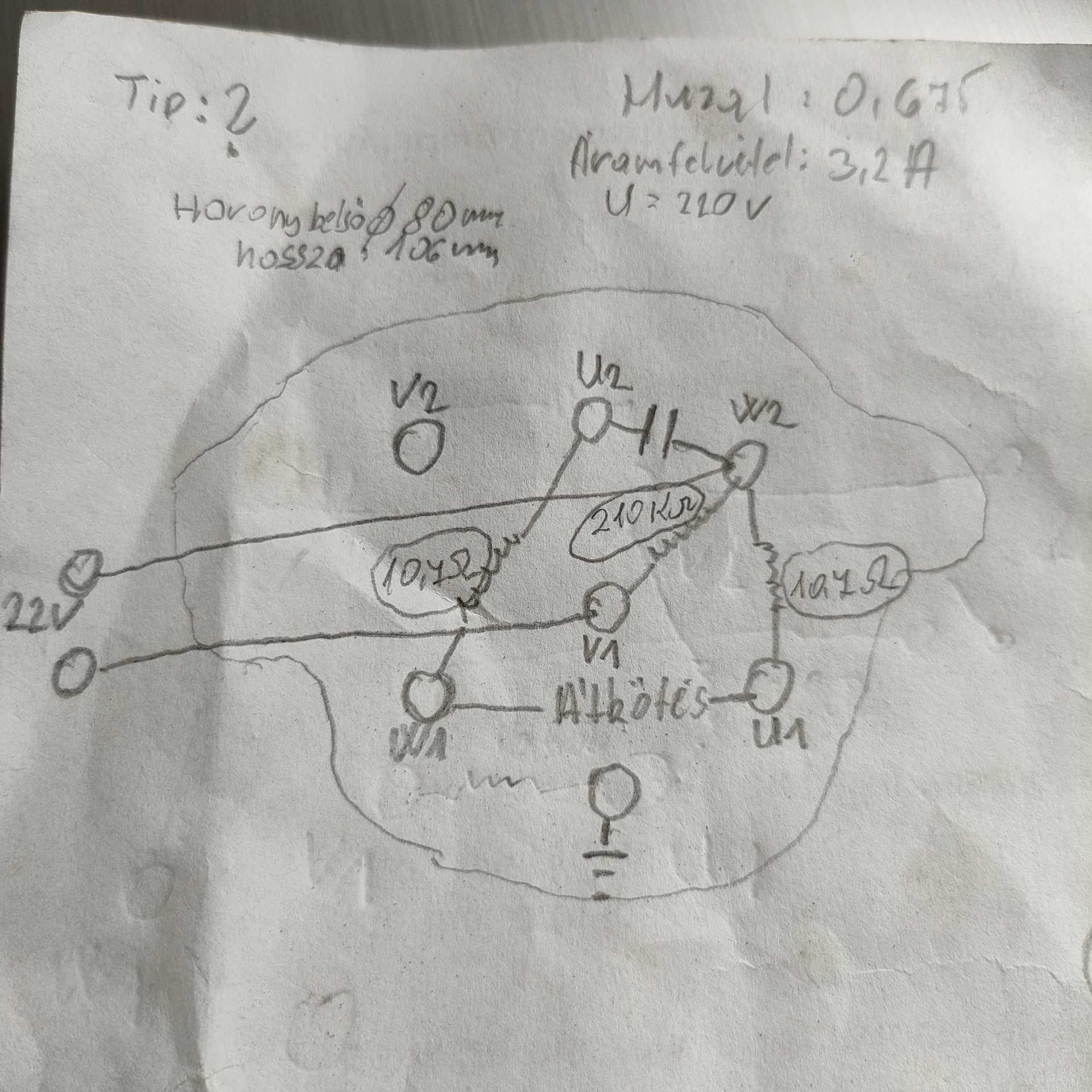 Mérésem szerint olyan1500 körüli fordulatra emlékszem. Én is úgy gondolom, hogy 3 fázisú tekercselés és a 210K ohmos tekercs menetzárlatos. Ez igy volt bekötve ahogy lerajzoltam. Holnap átnézem a huzal átmérőket mert csak az egyiket mértem meg. A facebook fórumon OZF80c-4k villanymotoron azonosították, (ahhoz nincs ilyen 2 lábas rajzom), csak nem tudom elérni az azonosítót.