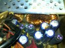 Egyfelöl a táp, amit ideiglenesen beraktam (Q-Tec) és kondikat cseréltem benne. Mi a frászt kerestek 10V-os kondik (gyárilag) a 12V-os ágon!? A másik, hogy tüzetesebben megnéztem azt a tápot, ami eredetileg a gépemben volt (Coolink AP-400X). Ez az, amelyik kikapcsolgatott, majd végül már nem indult a gép. Ez a táp a Prohardveren Didyman "nem ajánlott" listájában is szerepel, talán nem is a veszélyessége, mint inkább a megbízhatatlansága miatt: "Coolink APxxxX széria (gyenge készenléti kör, kondenzátorok)" Szóval ebben vannak púpos kondik. Mindegyik a kimenő ágaknál van. 3300µF-osak, 10 és 16V-osak (a 16V-osak a 12V-os ágon). Természetes jó tápgyártókhoz méltón fűtött helyen vannak, nehogy megfázzanak. Képeket csináltam, de ott már úgy látszanak, hogy a dzsungel felét lebontottam, hogy egyáltalán látni is lehessen valamit. A +5VSB ugyebár egy lila vezeték, ami nem erről a szakaszról indul ki, hanem befut a táp közepére. Ott van egy kondi, de egyelőre nem látom tisztán az értékét. Talán 1500uF. A 3. képen az látszik.