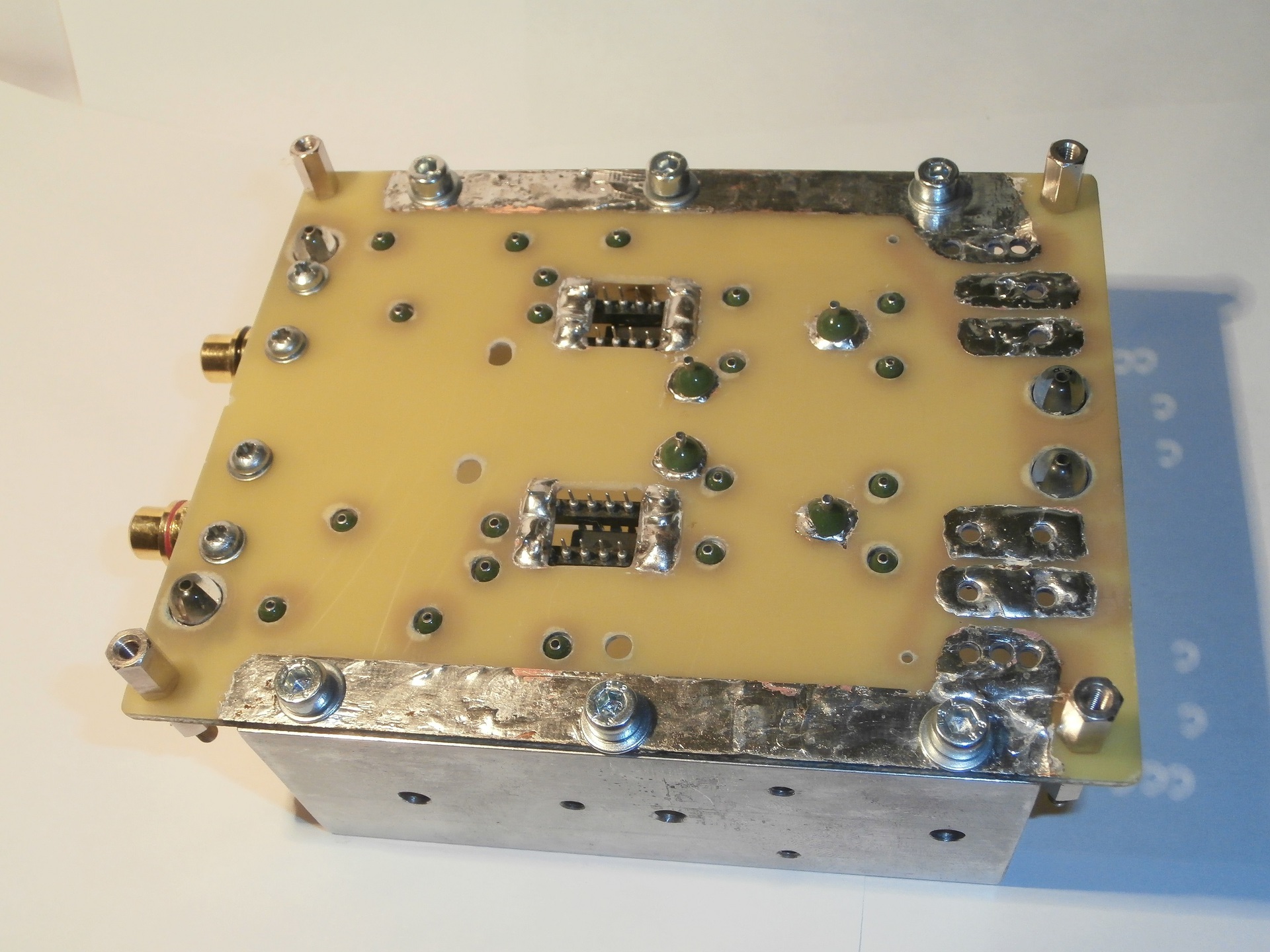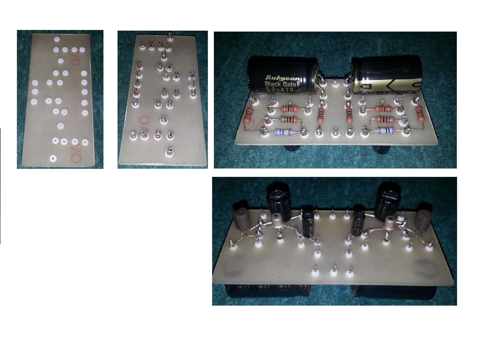 Szerintem, az élethűség megközelítése a tapasztaltságon kívül erősen pénztárca függő dolog. Nekem is erős megalkuvások jellemzik e dolgot. ha csak a tápokat nézem, kemény milliókkal jobbakat tudnék készíteni. És még nem is említettem a megfelelő hálózati szűrőket. Ami viszont elérhető számomra, azt lemondások árán is megszerzem. Utóbb TB javaslatára a kis áramú részek panelről leválasztása okozott nem kis meglepetést számomra, pedig eddig is voltak tapasztalataim a mi mit jelent dolgokban. Mindig azt hiszi az ember, hogy a bevált dolgok klónozásával könnyebbé lettek építései. És most visszafelé át kell építenie egy két dolgát az új eredmények miatt. És ami jelenleg látszik ehhez még fúrt rögtönöznie is kell. Amikor több mint 200 átvezető üveggyöngy birtokosa lettem, azt hittem ez elég lesz a terveimhez. Azonban a HC-TB-ME esetében jó 40, a RIAA korrektorom 60 darabba volt. Így világossá vált, hogy a tervezett felújítások után nem fog A KT féle VF4-re nem fog elég maradni. Az ezekhez való alkatrész beszerzéskor azonban belefutottam egy újabb lehetőségbe. A korom miatt nem nagyon van időm hosszú méla lesen mélázni, ezért megvásároltam a felmerül új lehetőséget. Az audiofilben minden kicsi dolog számít. Semmi sem egymaga a megoldás. Ami a lényeg ez ügyben (panelmentes építés), a lehetőségek szűkössége. Nagyobb üveggyöngyöt kapni még valamennyit, de ez kevés helyre megoldás. Amit én használtam már nem kapható, de adódnak más lehetőségek is. Tunerman fórumtársunk jelezte is ezt, de ő is csak alkalmi beszerzésből tudta ezt megoldani. És amit említettem, az utóbbi lehetőségem, amit ugyan már elképzeltem, de eszköz híján, csak homályos elmélet volt műhely híján, a teflonlapos megoldás. CNC-s lehetőségem sincs, ezért az állványos fúrógépembe befogtam egy kis tokmányt és egy sablonnal próbáltam egy dip8-as tokra furatokat készíteni, de a lefogás nem volt elégséges, és a sablon elcsúszott menet közben a próba kivitelezése során. Azonban így is látható, hogy alkalmas lesz a tüske IC-k telepítésére egy teflonlapra. Ez van a 3. képen.