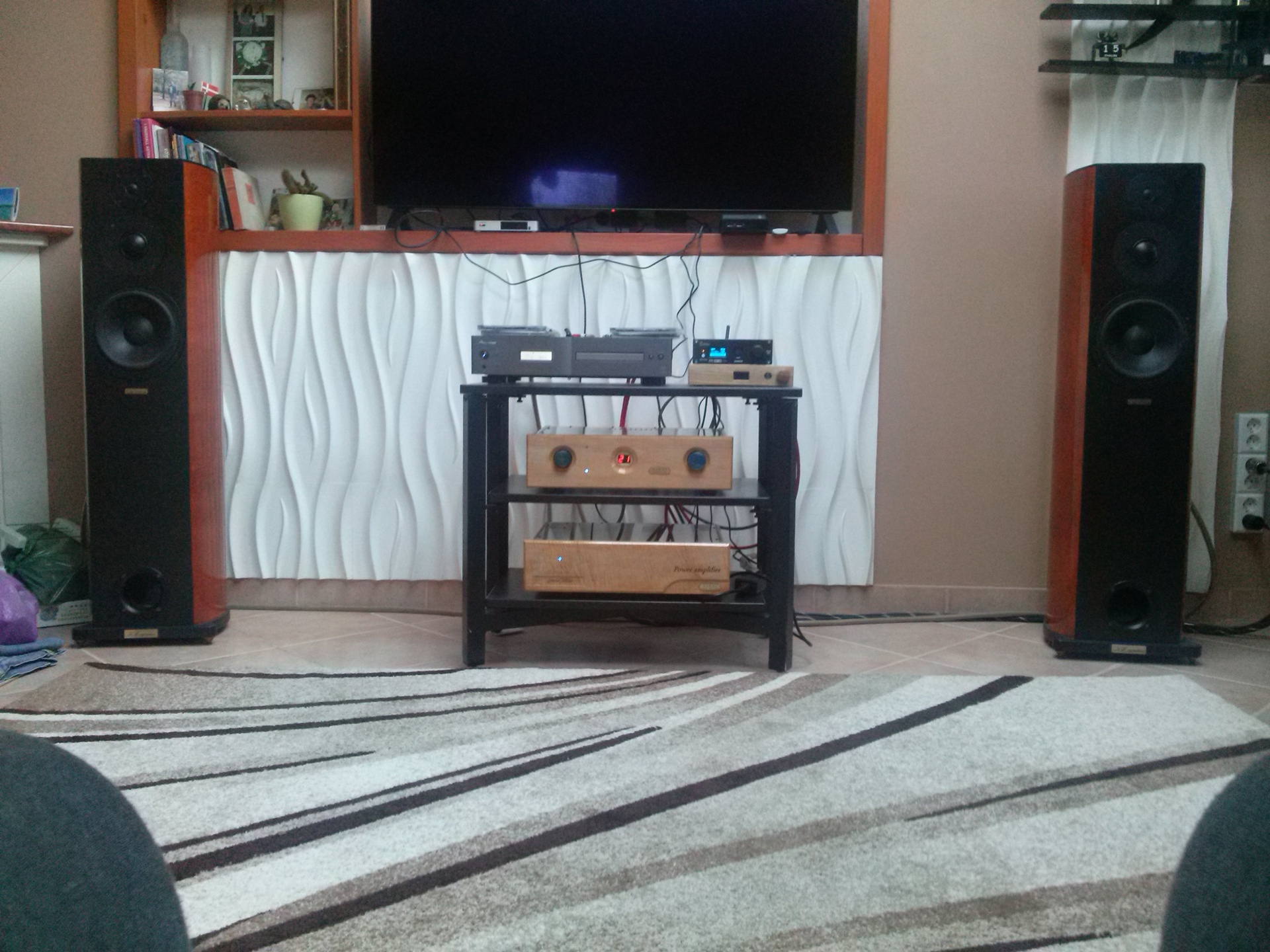 (Egyébként azóta már elhúzta a hátsó faltól kb.egy méterre... úgy emlékszem.) De nálam sem jobb az akusztika, viszont szakkönyvek vannak a dobozok mögött - a szekrénysorban - meg egy plüss elefánt, meg egy nem plüss teve. A földelt kimenetű miatt mutattam a képet Ge Lee-nek, hogy itt pl. jól szól (szerintem).