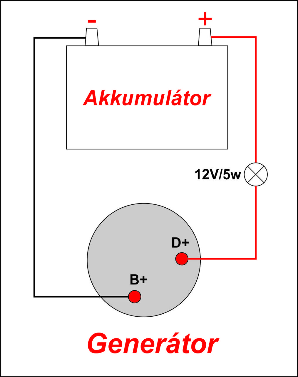 A B+ megy az akkumulátor + pólusára, a D+ a lámpán keresztül meg a akku pozitívra, az akku negatív meg a generátor testre.