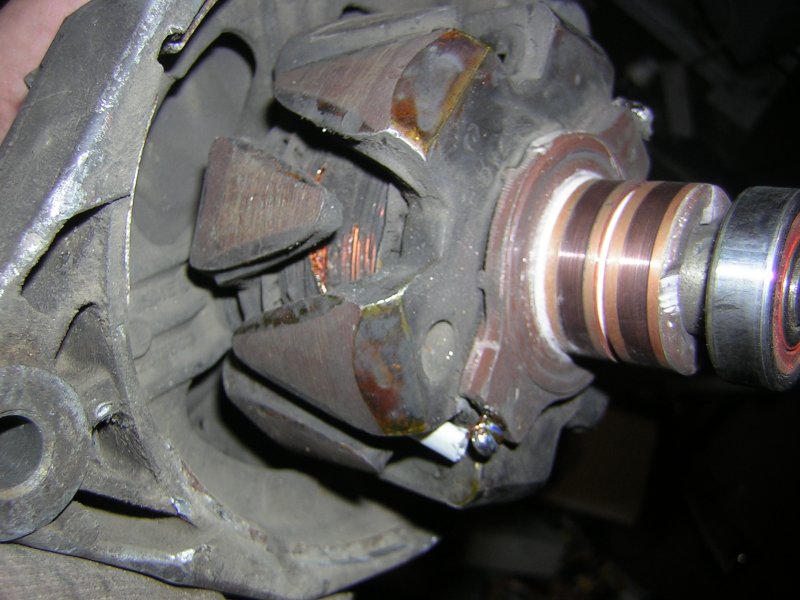 Végülis szét kellett húzni a generátort mert igy fértem hozzá a huzal végéhez,itt már jól látható volt hogy levált a huzal.
