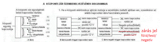 Ugyanez a bicskakulcsos riasztóm van, meg 2001-es Ibizám. Szerintem az lesz a megoldás amit Inhouse mondott, földre kötve az egyiket zár, a másikat nyit. Összeérintve pedig állapotot vált mellesleg. A probléma a rajzzal van. Ha megnézed a 1-es kapcsolás negatív részének rajzát (C ábra) és összeveted a relés vázlattal rájössz mi a baj. Az alsó 2 vezeték rosszul van rajzolva, logikusan fölülről lefelé nemkapcs.-nyitás-test majd nemkapcs.-zárás-test lenne. Nekem így van kötve és minden ok. Csak az a furcsa, hogy nálad NYITÁS nincs, ZÁRÁS van. De egy próbát megér.