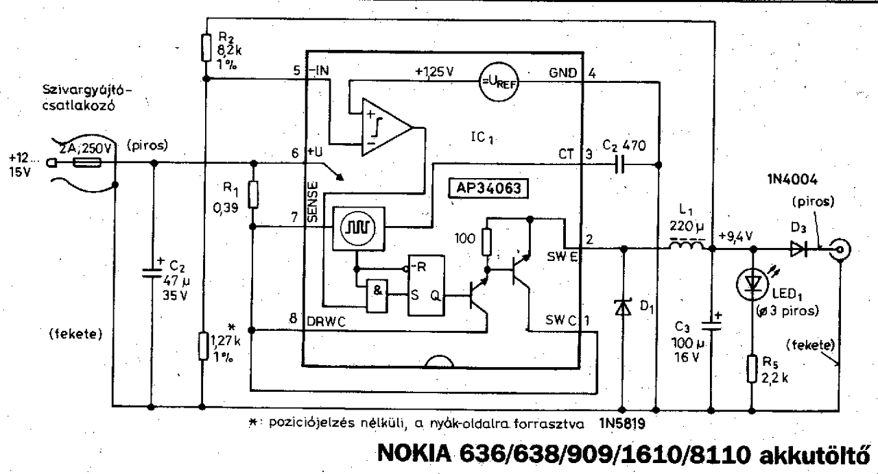Itt egy gyári Nokia töltő rajza. Szinte a 34063 alapkapcsolása. Viszont ez még a régi Nokiákhoz készült, ha USB-s telóhoz kell, akkor a kimenetet át kell állítani 5-5,5V közé. Ez vagy az R2 vagy a csillaggal jelölt 1,27kOhm cseréjével lehetséges.