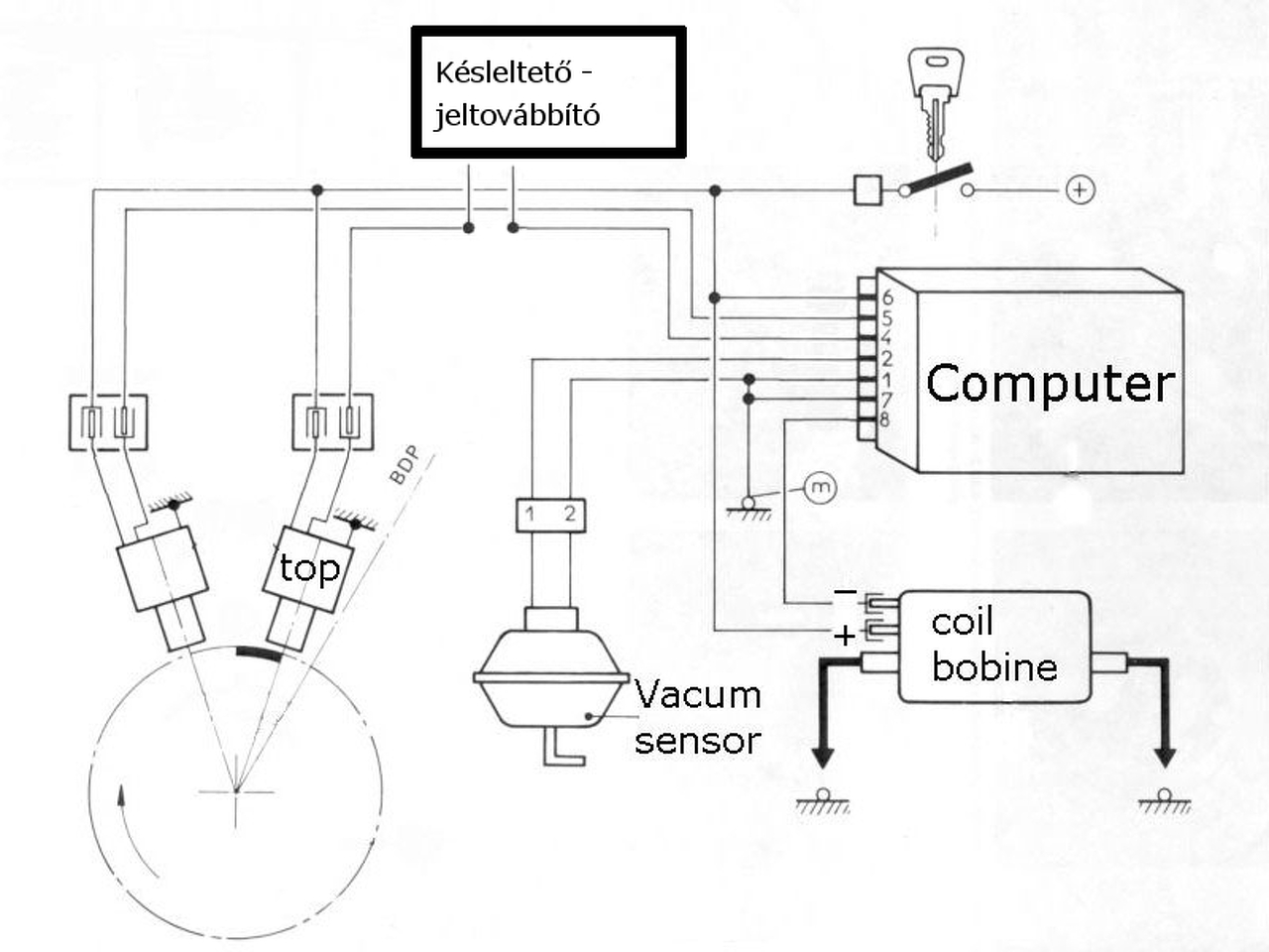 A TOP feliratú szenzor fix 10 fokon áll, ez az alapelőgyújtás, aminek a fizikai állításával lehetne az előgyújtást szabályozni. De ez fix, szóval nem állítható.
