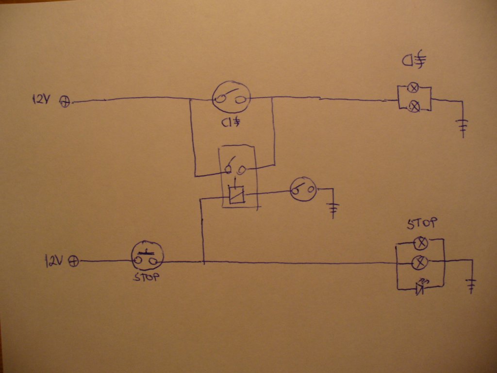 Ha a relé által kapcsolt szálba be lenne téve egy ellenállat vagy fogyasztó, hogy mégse legyen olyan durva a ködlámpa fénye féklámpaként... akkor még egy dióda kelle, hogy ködlámpa üzemben fékezéskor ne csökkenjen a fénye. ( ? )
