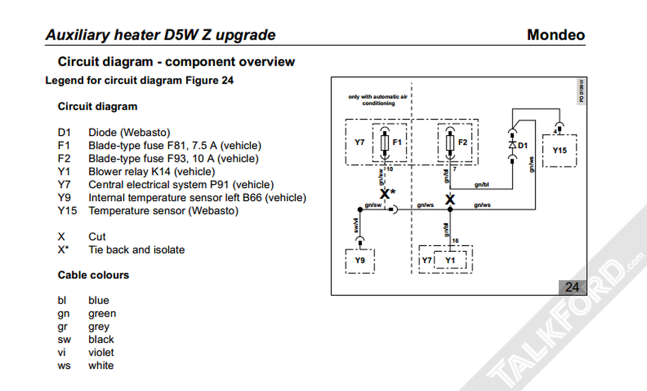 Megkeresed melyiken kap 15A-t a fűtőrendszer, ez gyakorlatilag gyújtás, de start állásban oldott gyújtás. Ezt a kábelt elvágod, és raksz oda 5 lábú váltóérintkezős relét. A gyújtáskapcsolótól menőt a relé 87A lábára kötöd, a másik oldalit a 30as lábra. 87-esre az akksi pozitívjától kötsz 20A-es biztosítékkal "direkbe" pozitívot. A relé tekercsvezérlője a 86 negatív, és 85 pozitív, ezt bekötöd a Webasto állófűtés relé kimenetre, értelemszerűen ha negatívot vezérel ki akkor a 85 lábat hozzákötöd a 87re kötött "direkt" pozitívhoz, s a 86ot az állófűtés kimenetre. Ha pozitívot vezérel, akkor testre kötöd a 86os lábat a kasznihoz, s a 85re a vezéreltet. Nézd meg hogy 200mA-es vagy max 50mA-es relékimenete van-e az utólagos állófűtésnek, mert ez utobbinál 5 lábú mikrorelét kell választanod. Mivel van memóriája a Mondeo digitpanelnek, íg megjegyzi mindig az aktuális, motorleállítás pillanatában hagyott állapotot, tehát ha nem Off állásban hagyod a vezérlőt, működni fog.